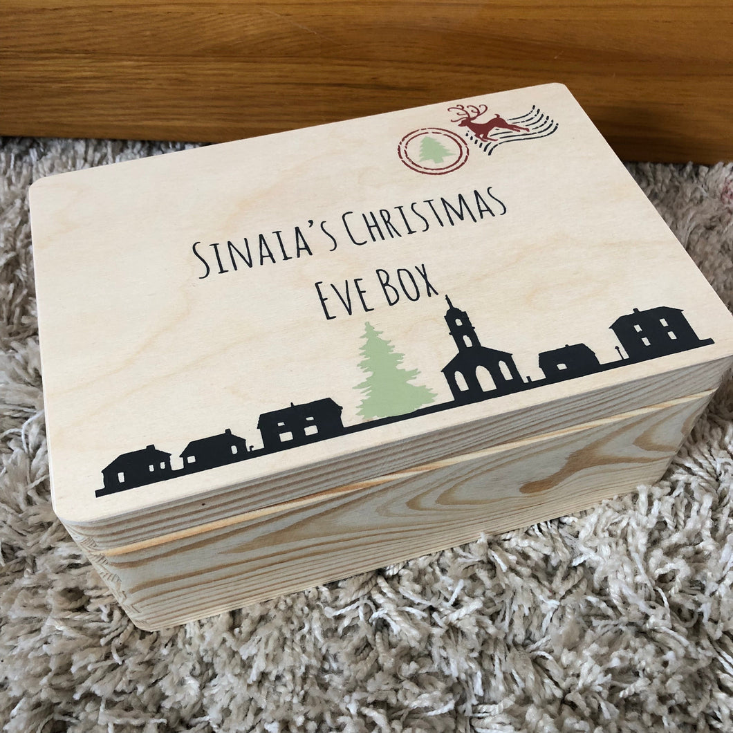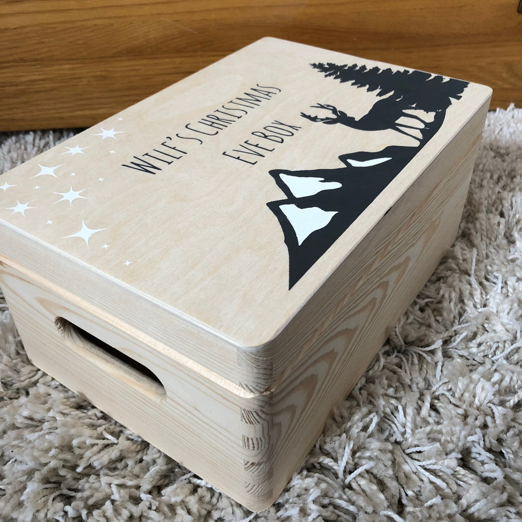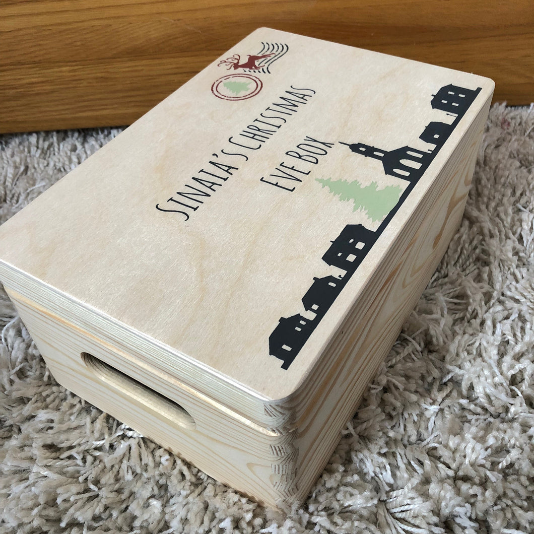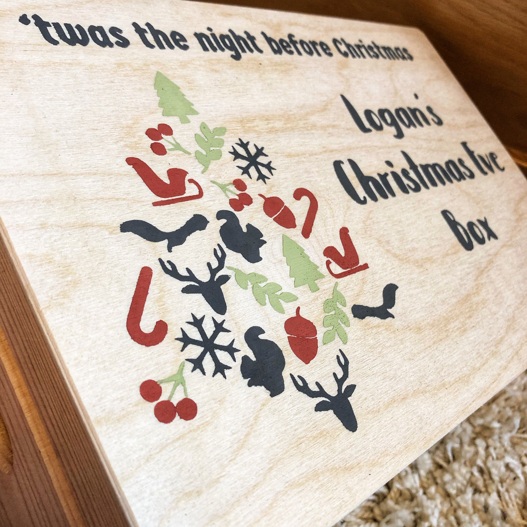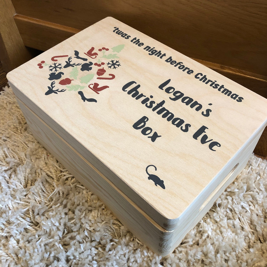 Beautiful hand painted Personalised wooden Christmas Eve box, the best quality pine is used to craft this beautiful box, with double hinged lid and curved edges , hand painted with your choice of name(s) and choice of design.