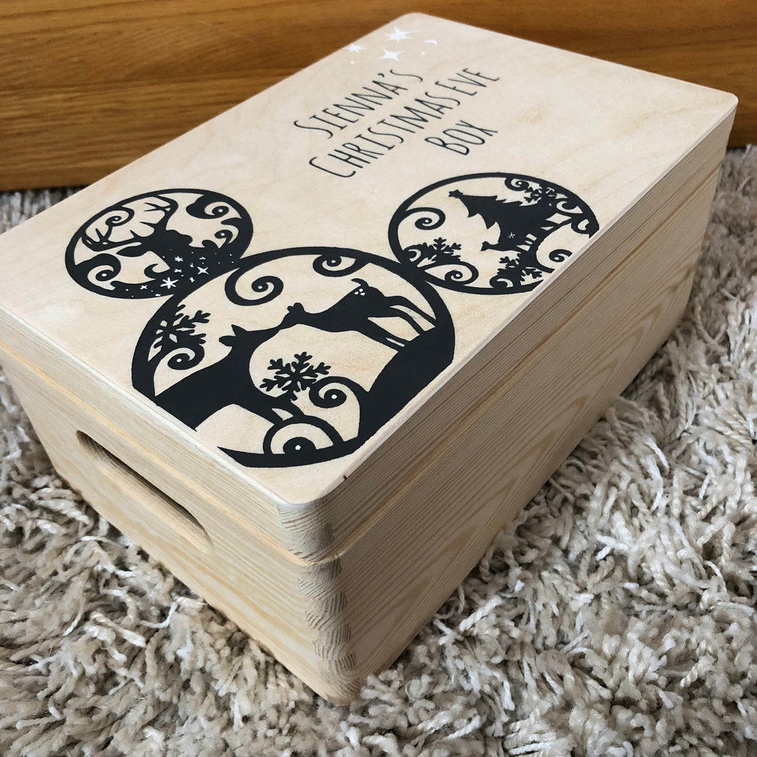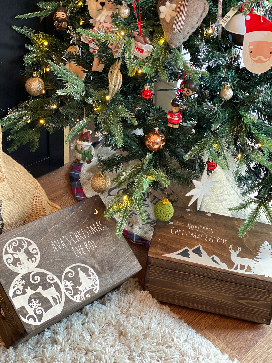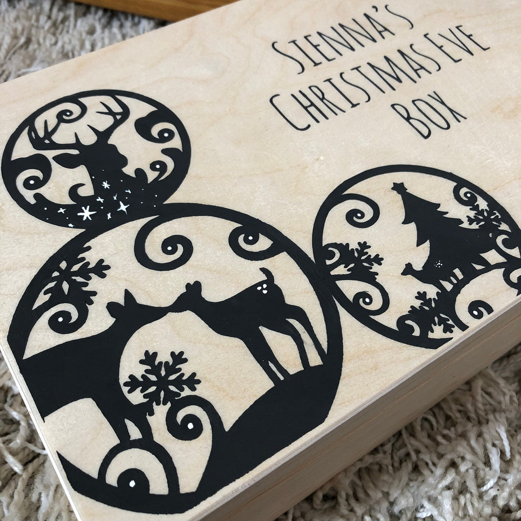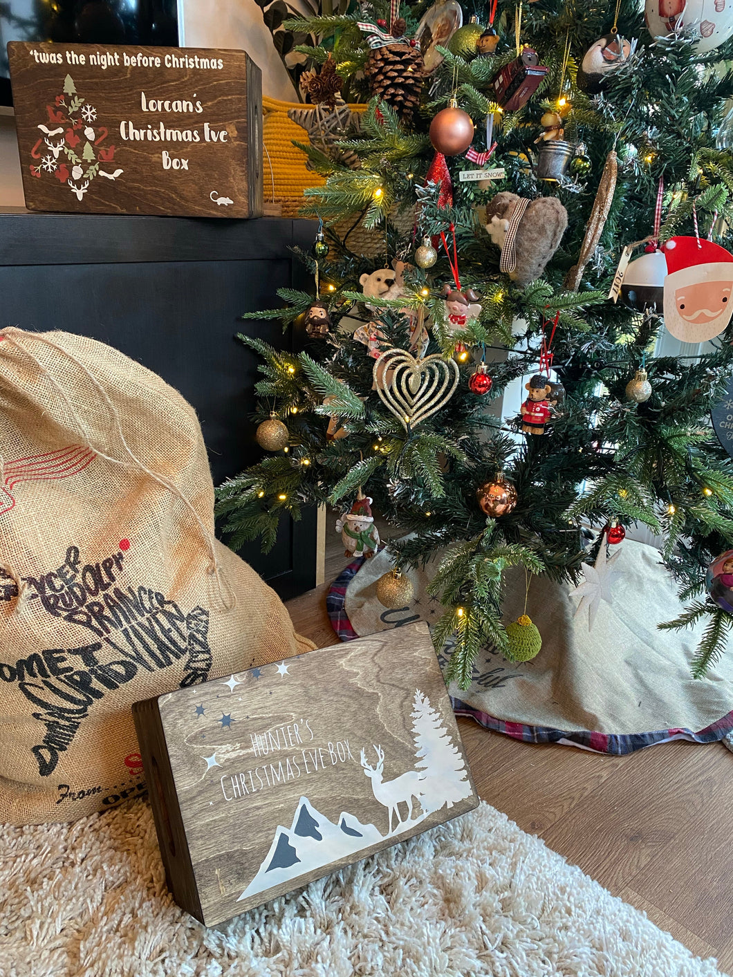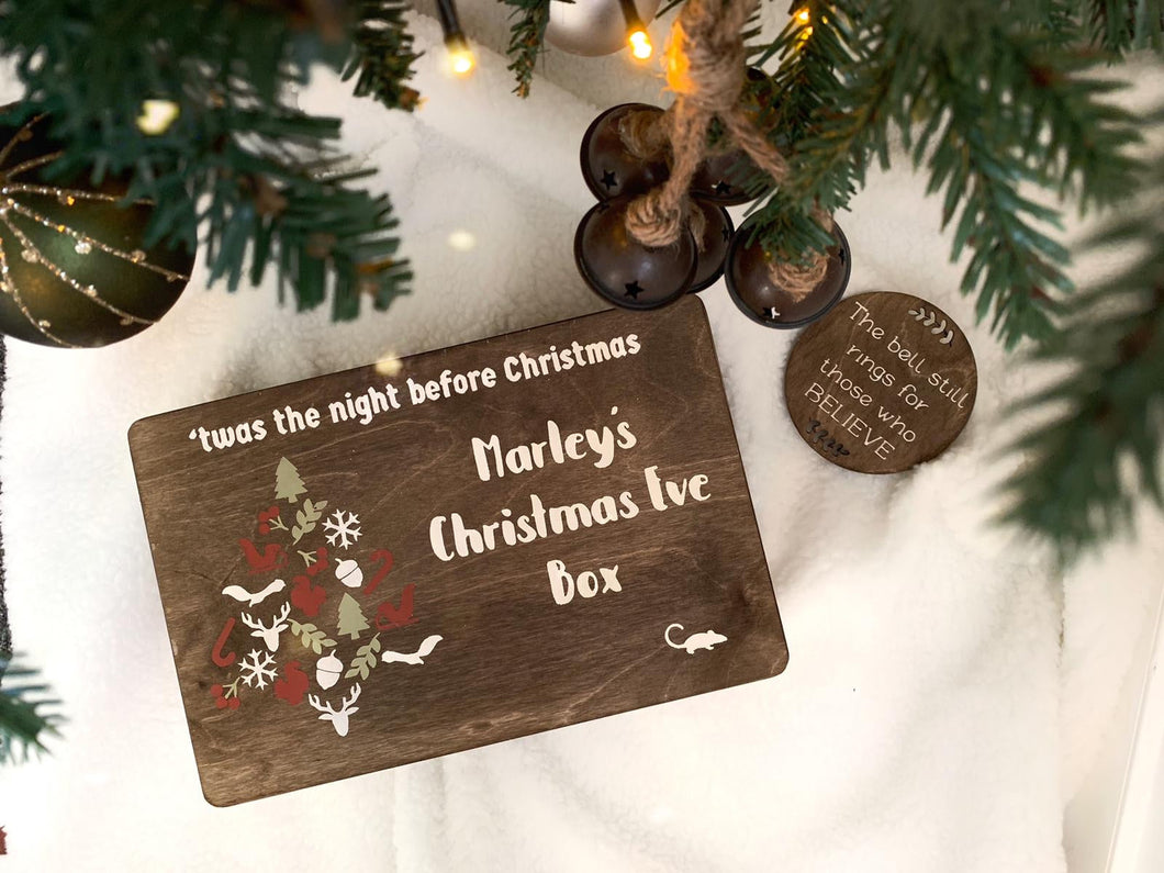 Beautiful hand painted Personalised wooden Christmas Eve box, the best quality pine is used to craft this beautiful box, with double hinged lid and curved edges , hand painted with your choice of name(s) and choice of design.